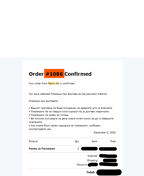 По успешно направена нарачка, на вашата е-пошта ќе добиете потврда со код за нарачка, кој можете да го користите за проверка и следење на статусот на нарачката.
