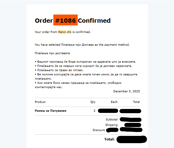 По успешно направена нарачка на rancimk.com, ќе добиете ваква потврдна е-пошта на адресата што ја наведовте при нарачувањето.